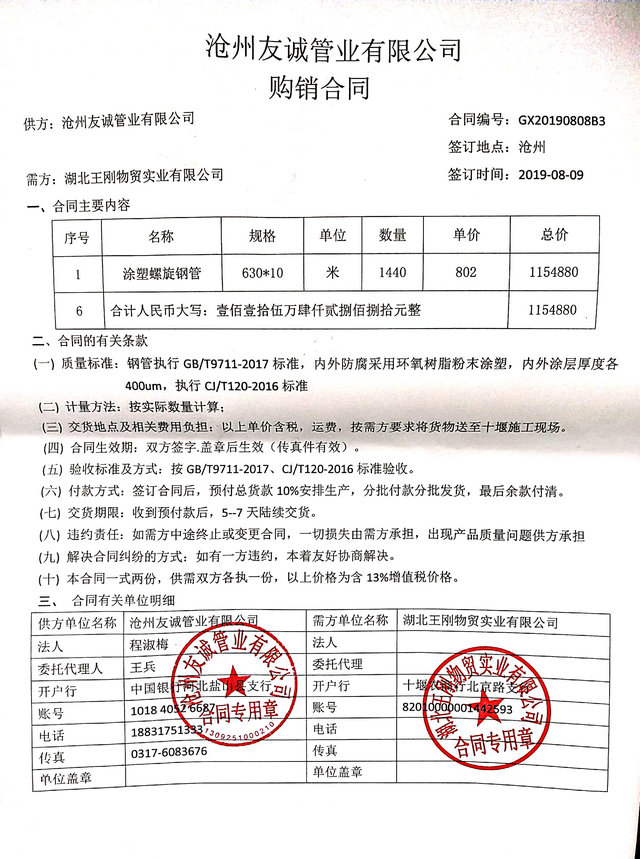 2019年8月9日我公司與湖北王剛物貿(mào)實(shí)業(yè)有限公司簽署購(gòu)銷合同,市政管廊工程用DN600涂塑復(fù)合鋼管1440米,我公司專業(yè)于涂塑復(fù)合鋼管領(lǐng)域,目前國(guó)內(nèi)多地區(qū)的管廊工程建設(shè),給排水管道多用于涂塑復(fù)合鋼管,今后我們多重視于產(chǎn)品質(zhì)量,提高服務(wù)