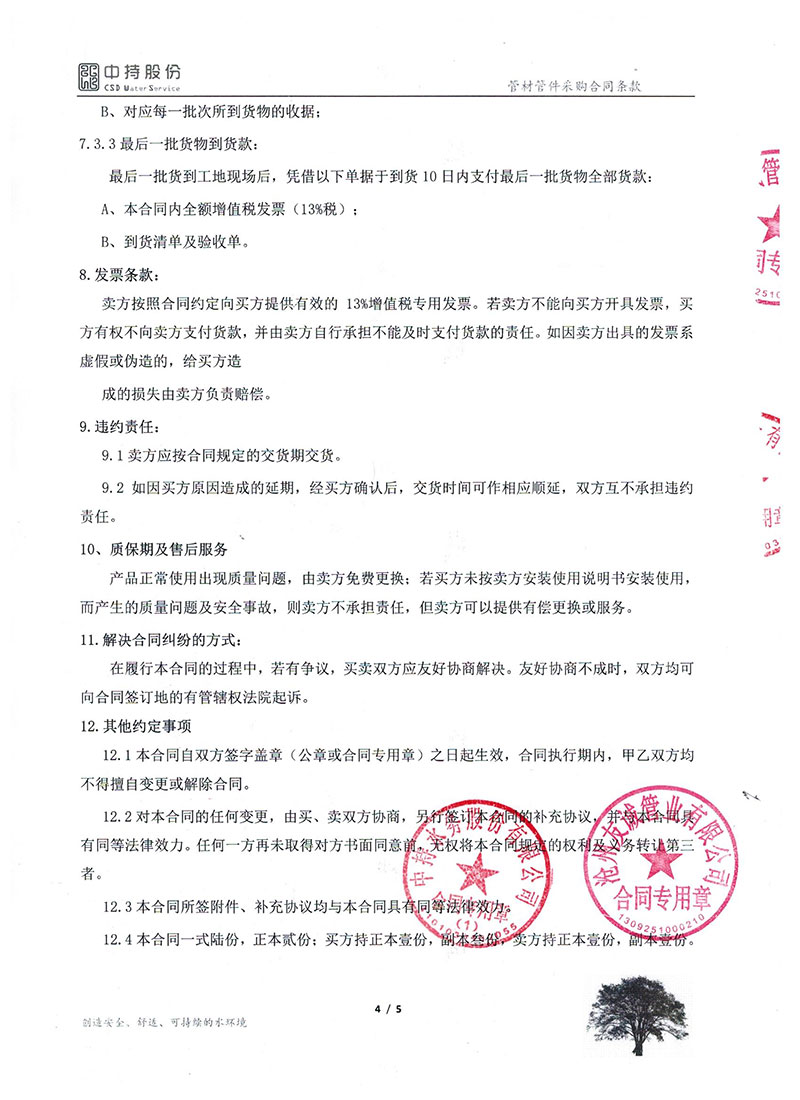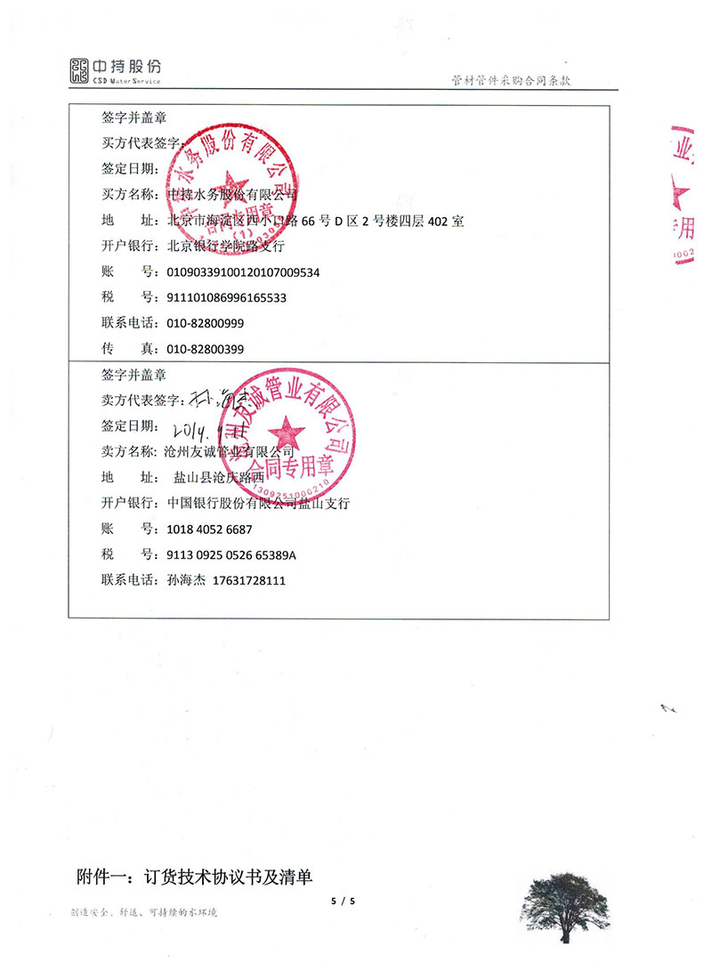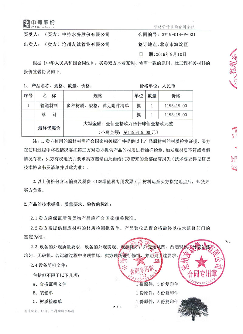 2019年9月份,友誠管業(yè)與中持水務(wù)股份有限公司(上市公司),簽訂了原陽縣污水處理廠項目的防腐螺旋鋼管合同,非常感謝貴公司對我們的信任,我們也一如即讓的做好每一支鋼管